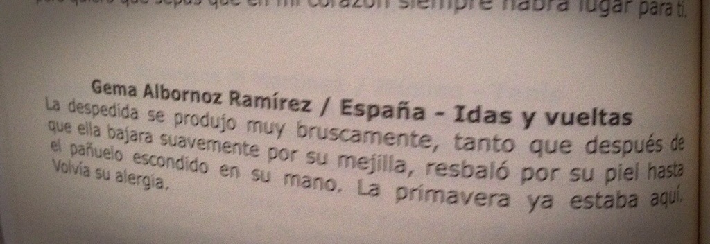 Como os comentaba al principio, antes de ese paréntesis enorme explicativo, al ver esa página me puse instantáneamente a escribir para presentarme al concurso de Microrrelatos y de Microcuentos que tenían. El resultado de uno de ellos ya salió, y es muy poquita cosa pero me hace ilusión, no gané y ni siquiera fuí finalista pero fui seleccionada a aparecer en un libro que publican con la temática del concurso…»La primavera…la sangre altera» .Como es la primera ocasión en la que mis palabras tocan hojas impresas dentro un libro publicado pues me hace muchísima ilusión, aunque en realidad se que hay muchísimos seleccionados más…Por algo hay que empezar…